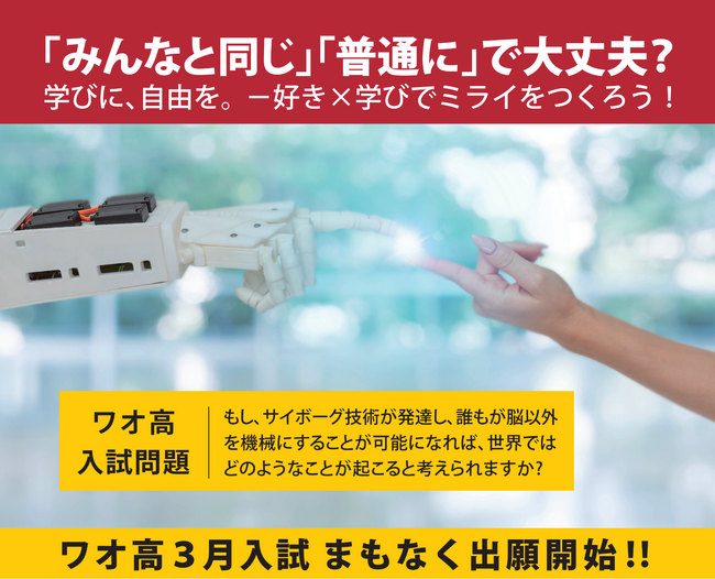 「その高校で『なりたい自分』になれますか?『 みんなと同じ『普通』に流されていませんか?」いま、高校受験を控えている全国の中学生に、改めてこのメッセージをワオ高校は届けます。高校受験の今こそ、自分の未来を真剣に考えるチャンスです。すでに別の学校へ出願済みという皆さんも、もう一度自分の心に問いかけてみてください。「好き×学び」の自由な学び方で、高校生のうちからいち早く夢の実現に取り組み、自分だけのミライをつくる、シン・通信制高校 ワオ高校という選択を検討いただきたいと思います。