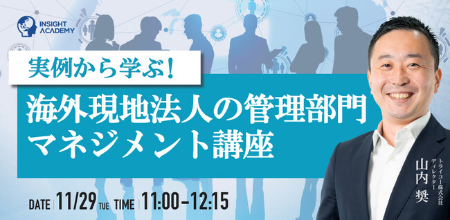 グローバル人材育成・研修業を手掛けるインサイトアカデミー株式会社(東京都港区、代表取締役:北村嘉章)は、2022年11月29日(火)11時より、無料webセミナー「実例から学ぶ 海外現地法人の管理部門マネジメント講座」を開催します。現在、お申込み受付中!
