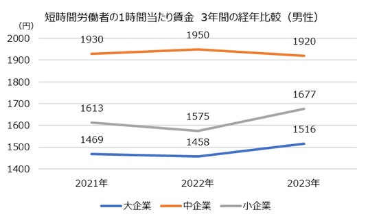 短時間労働者の1時間当たり賃金について、3年間の経年比較を実施したところ、2022年調査同様、2023年時点においても、中企業、小企業、大企業の順に賃金が高くなっていることが分かりました。