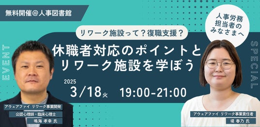 さらに、最近注目されている「リワーク施設」の仕組みについてもご紹介いたします。休職者がリワーク施設を利用するメリットや、企業側が押さえておきたい手続きの流れを詳しくお伝えします。実際にリワーク事業を手掛ける株式会社Awarefy(以下アウェアファイ)のメンバーから、現場のリアルな声とともに最新の情報を得られる貴重な機会です。職場のメンタルヘルス対策を強化したい人事担当者の皆さま必見のイベントです。