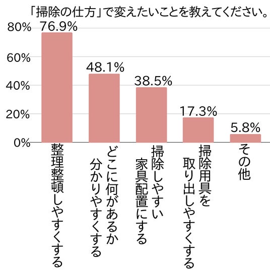 第3位・第4位は掃除効率を上げるための工夫が並びました。「掃除しやすい家具配置にする」(関東38.5%・全国29.0%)では、自宅のレイアウトやモノの置き方の工夫で掃除効率を上げたいと考える方が多く、「掃除道具を取り出しやすくする」(関東17.3%・全国18.1%)では、長い・形状が特殊・濡れた際に乾かしたいなど、自宅のモノのなかでも掃除道具の置き場所が難しいことや、掃除道具・洗剤、掃除場所により置き場所がバラバラになる、掃除場所から離れたところに置いてあり効率が悪いなど、使いやすく取り出しやすい場所を確保する難しさが浮き彫りになりました。