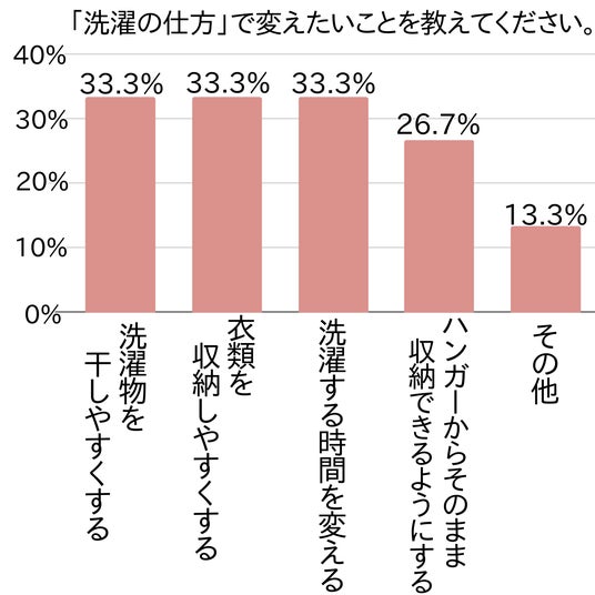 全国の第1位・第2位・第3位の順に挙げると「衣類を収納しやすくする」(関東33.3%・全国53.3%)が最も多く、食事・掃除と同様、洗濯関連でも収納と整理整頓が家事効率アップのキーワードとなっていました。