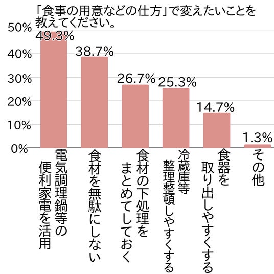 これまでに挙がった「賞味期限の管理」がしやすくなる収納の工夫や「食材の下処理」を活用しやすくする冷凍庫の配置など、食事の用意や料理をより良くする上で食材・食器類などの整理整頓が非常に大切であることがわかる結果となりました。