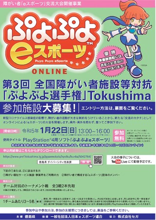 徳島県では、株式会社セガ様のご協力のもと、今年も『全国障がい者施設等対抗「ぷよぷよ選手権」Tokushima』をオンライン開催します。優勝・準優勝施設には、豪華セガグッズをプレゼント!ご参加お待ちしています。