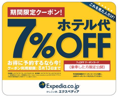 エクスぺディアで旅行を予約する際、予約確定画面のコード入力欄に、「世界旅行」車両 ドア部分ステッカーにあるクーポンコードを入力いただくと、ホテル代金が7%OFF*となります。