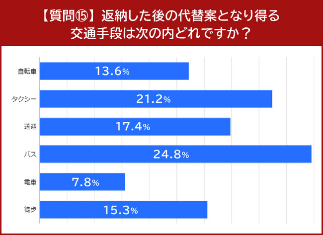 「返納した後の代替案となり得る交通手段は次の内どれですか?」との質問には、「バス」と答えた人が最多で24.8%でした。