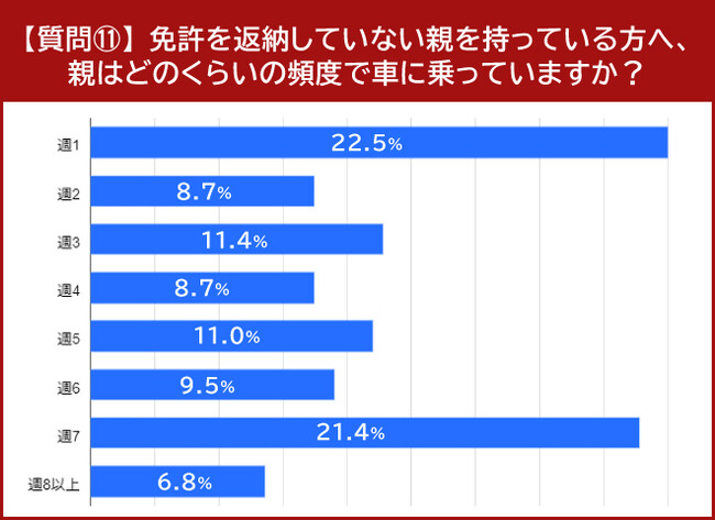 親が車に乗る頻度は「週1」が22.5%、「週7」が21.4%でほぼ並ぶ