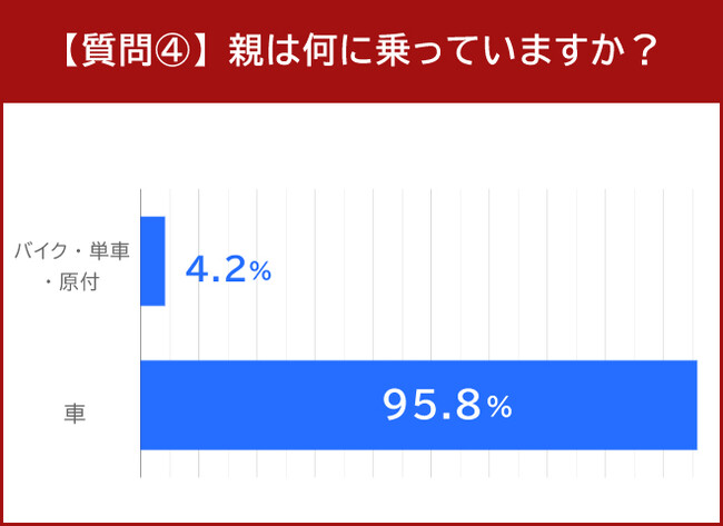 「親は何に乗っていますか?」というアンケートでは、95.8%にあたる452人が「車」と回答しました。