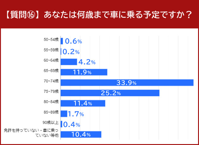 「あなたは何歳まで車に乗る予定ですか?」という質問には、33.9%にあたる160人の人が「70~74歳」と回答して最多でした。