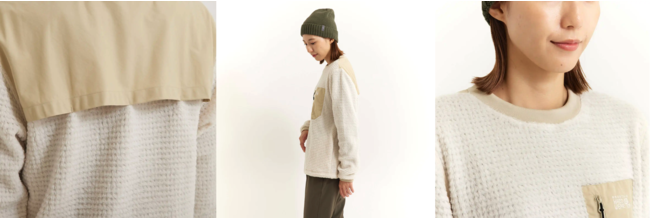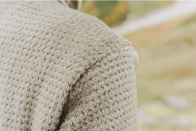 主素材には、フリース素材のパイオニアPOLARTEC(ポーラテック)社の「High Loft Grid(ハイロフトグリッド)」を採用。凹凸のあるグリッド構造を備える新素材です。ハイロフトグリッドは、メッシュのように薄いグリッドの凹部分が通気性を確保する一方、凸部分であるフリースの長い毛足がデッドエア(衣服の内部に抱き込まれる、動かない空気)を蓄えることで保温性を兼ね備えるという2つの機能を有しています。