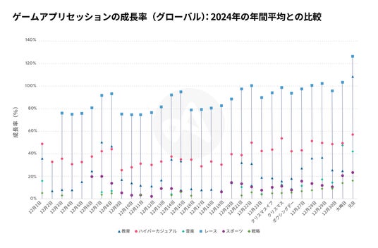 ゲームセッション数は、ジャンルを問わず安定して増加しました。特に月末には大きな伸びを見せ、新年を迎えるにあたって参加型のエンターテイメントの需要が高まった影響もあり、元旦には最大のセッション数を記録しました。特に、レーシングゲームはピーク時のセッション数が年間平均を124%上回る結果となりました。これは、年末年始の休暇中にユーザーがエネルギッシュなエンターテイメントを楽しんだことが要因と考えられます。さらに、ハイパーカジュアルゲームのセッション数も57%増加し、忙しい年末年始において手軽に楽しめるエンターテイメントが好まれていることを示しています。一方、教育ゲームは月末に大きな成長を見せ、セッション数が106%増加しました。また、音楽ゲームも高いエンゲージメント数を記録し、大晦日には47%増加、元日には41%増加しました。