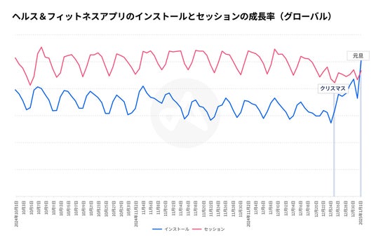 さらに、12月末にはヘルス&フィットネスアプリのアクティビティが急増し、12月30日にはインストール数が27%増加しました。さらに、新年に多くのユーザーが新たな目標に取り組み始めたため、2025年の元旦にはインストール数が46%増加する結果となりました。