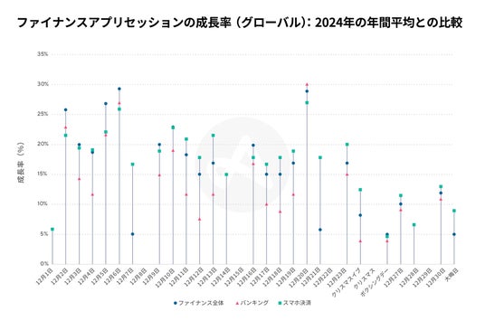 12月は、全体を通してファイナンスアプリの利用が活発化しました。特に12月20日にはファイナンスセッションのポイントが年間平均を29%上回りました。これは、クリスマスを控えたユーザーが年内にやり残したタスクを片付けたことが主な要因と考えられます。一方で、クリスマスイブとクリスマス当日はアプリの利用が一時的に低下しましたが、クリスマスを過ぎると再びアプリの利用が増加します。12月30日には決済アプリの利用が13%増加し、ファイナンスアプリ全体の利用も再度急増しました。この傾向は、年末の支払いを済ませ、新年に向けた資金管理を始めるユーザーの行動を反映しています。