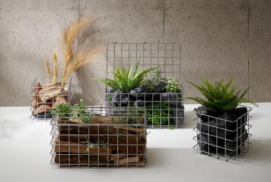 メッシュ状のカゴに自然石を入れたガーデンツール。室内外でさまざまな使い方が楽しめます。