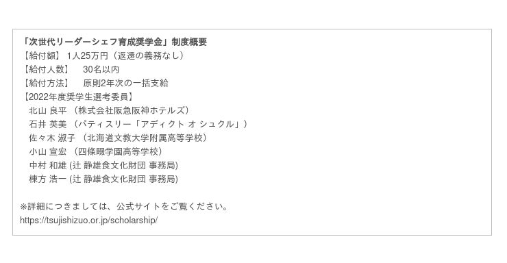 食分野の教育と研究に生涯を捧げた辻調グループの創設者である辻静雄の志を受け継ぎ、2015年に設立された「辻静雄食文化財団」では、全国の高校2年生を対象とした、「次世代リーダーシェフ育成奨学金」の給付を行っております。今年度も厳正な選考を経て、2022年度(第8期)の奨学生として30名を採用いたしました。