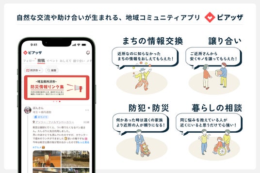 地域コミュニティアプリ「ピアッザ」は、地域で暮らす人々が集まり、地域情報の交換や不要品の譲り合いなどを通じて、地域の中で自然な交流や助け合いが生まれる地域プラットフォームです。