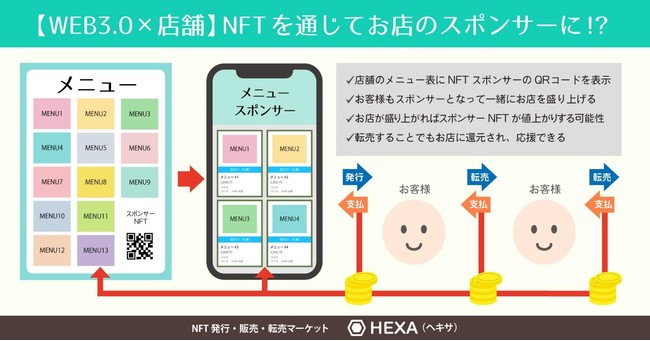 そこで当社は、NFTマーケットプレイス「HEXA(ヘキサ)」を運営するメディアエクイティ社と協働し、飲食店と支援者のつながりを新しく構築することで飲食店の継続・発展を後押しするプロジェクトを始動いたしました。
