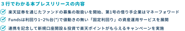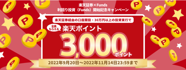 当社では、本取り組みを記念して、2022年9月20日~2022年11月14日の期間中に楽天証券経由でFundsの新規口座開設を行い、30万円以上の初回投資をされた方を対象に、もれなく「楽天ポイント」を3,000ポイント進呈するキャンペーンを予定しております。