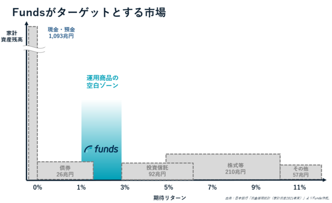 資産形成の手段としては、定期預金や債券、株式をはじめ様々な投資対象がありますが、Fundsでは預貯金と株式の間のリスクリターンを享受できる金融商品を提供しています。