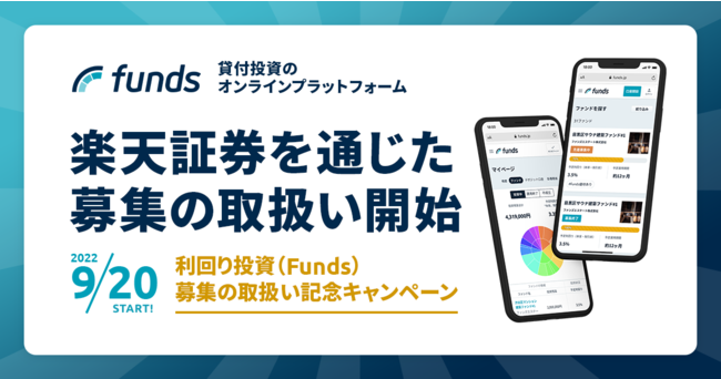 貸付投資のオンラインプラットフォーム「Funds(ファンズ)」を運営するファンズ株式会社(本社:東京都渋谷区、代表取締役CEO:藤田雄一郎、以下 当社)は、2022年9月20日より、楽天証券株式会社(本社:東京都港区、代表取締役社長:楠雄治、以下 楽天証券)を通じて、当社が取扱うファンドの募集の取扱いを開始することをお知らせいたします。