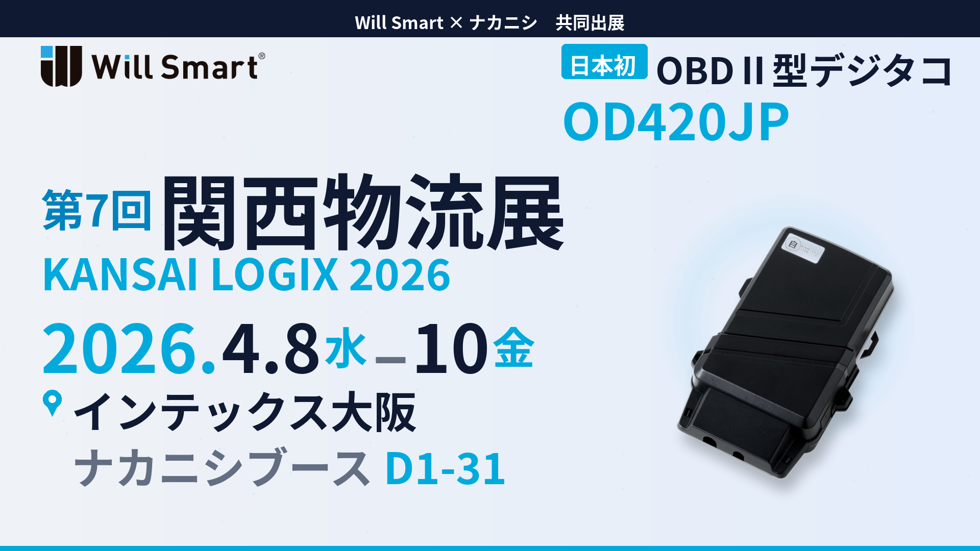 「移動」を支えるテクノロジー企業として物流DXの課題解決に取り組む株式会社Will Smart(東京都江東区 代表取締役社長:石井康弘、以下 Will Smart)は、2026年4月8日(水)・9日(木)・10日(金)にインテックス大阪で開催される「第7回 関西物流展 KANSAI LOGIX 2026」において、株式会社ナカニシ(本社:千葉県市川市、代表取締役:中西 祐介、以下 ナカニシ)のブース内で、日本初(※)のOBDII型デジタルタコグラフ(型式名:OD420JP)を出展することをお知らせいたします。