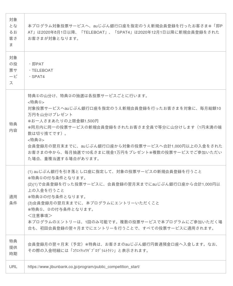 本プログラムでは、対象の投票サービスへauじぶん銀行口座を指定のうえ新規会員登録を行ったお客さまを対象に、毎月総額10万円を山分けプレゼントします。さらに、会員登録の翌月末までに合計1,000円以上の入金を行ったお客さまの中から、毎月抽選で10名さまに現金1万円をプレゼントします。特典の山分け、抽選は各投票サービスごとに行うため、複数の投票サービスでご参加いただくことができます。