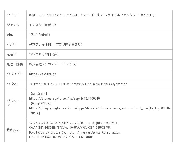 ※ SQUARE ENIXおよびSQUARE ENIXロゴ、ファイナルファンタジー/FINAL FANTASY、WORLD OF FINAL FANTASY メリメロは、日本およびその他の国におけるスクウェア・エニックス・グループの商標または登録商標です。