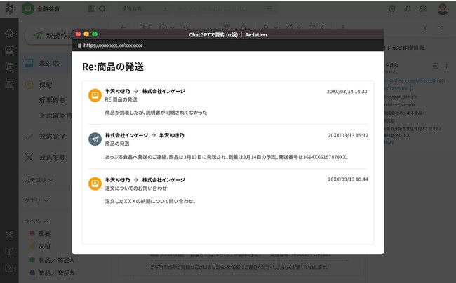 『Re:lation』上でChatGPTを利用し、チケット(※2)内のメッセージを要約できる機能です。一つひとつメールやメモの内容を読み込むことなく概要を把握できるため、忙しい時でも時間をかけずに内容を確認することができます。