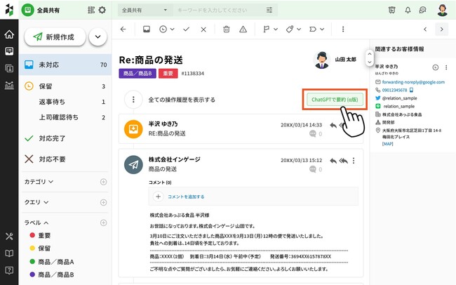 別の社員が担当していた件を引き継いだ際に【要約ボタン】をクリックするだけで、これまでどのようなやり取りをしていたのかすぐに把握できる。