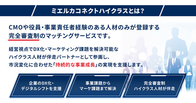 事業成長を強力にサポートするマーケティング力を手に入れたい経営者・事業責任者の方は、ぜひミエルカコネクト ハイクラスへご相談ください。