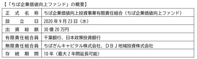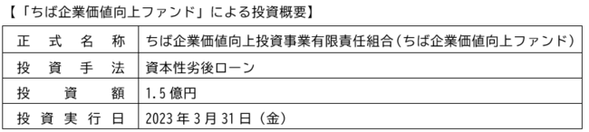 本ファンドは、千葉県とその隣接する地域において事業基盤の強化や事業拡大に向けた新規投資を行う法人を主な投資対象とし、資本性劣後ローンや優先株式等の資本性資金の手法を活用する点が特長となっています。