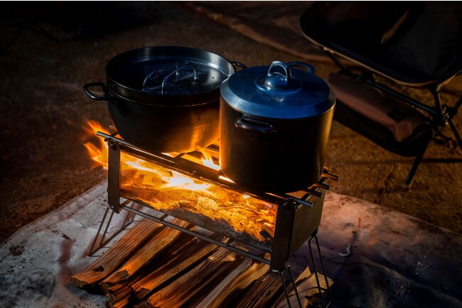 メッシュ式焚火台の燃焼効率はそのままに、メッシュを凹型にしたことで火の粉や灰が風で舞ってしまうのを防ぎます。また、側面のメッシュから炎が透けて見えるため、薪ストーブのように炎を楽しむことができます。