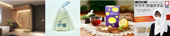 ・サウナフェア出展社(一部紹介):写真左から秀建グループ、「サ道」コラボサウナグッズ、合同会社DAGAN、TM’s