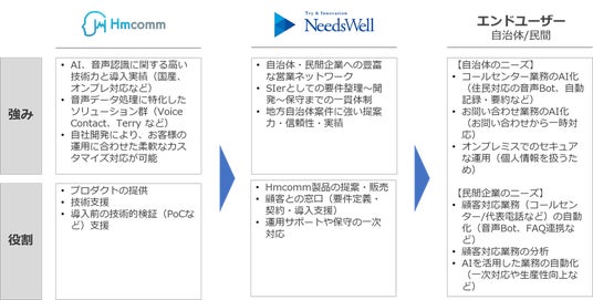 Hmcommは、創業以来、産総研発の音声処理技術を基盤とした革新的なAIソリューションを民間企業向けに提供してきました。一方、ニーズウェルは、ソフトウェアの開発・運用・保守からソリューション製品の開発・販売まで幅広く手がけ、特に自治体向けの豊富な経験と実績を持つ企業として、中小企業から大企業、地方自治体まで幅広い顧客基盤を有しています。