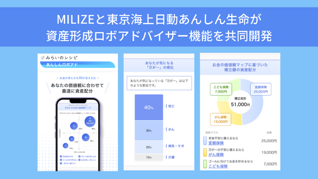 株式会社MILIZE(本社:東京都港区、代表取締役社長:田中 徹、以下「MILIZE」)と東京海上日動あんしん生命保険株式会社(東京都区、取締役社長 川本 哲文、以下「東京海上日動あんしん生命」)は、将来の収支予測や資産形成アドバイスを行うWEBアプリ「みらいのレシピ」内の資産形成ロボアドバイザー機能を共同開発しました。2023年5月30日から、資産形成ニーズを有する顧客会員や従業員を有する企業に本サービスを提供し、各企業のプラットフォームやコミュニケーションツールを通して、個人のお客様が利用できるようになります。