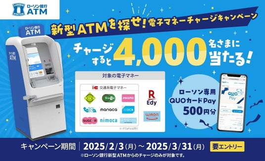 2025年2月3日(月)から3月31日(月)まで、ローソン銀行ATM新型機で電子マネーにチャージすると、抽選で4,000名さまにローソン専用QUOカードPay 500円分をプレゼント!