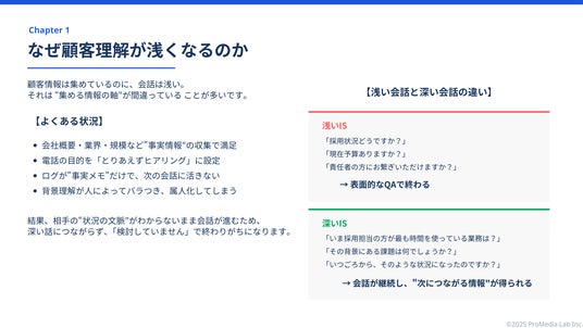 株式会社プロメディアラボ(本社:東京都中央区、代表取締役:廣瀬義憲)は、インサイドセールスの成果を左右する“顧客理解”にフォーカスした資料『インサイドセールスの“顧客理解”が浅いと成果が止まる - 会話が続くISと続かないISの決定的な違い -』 を公開しました。