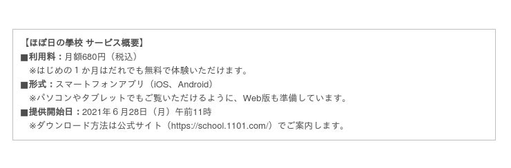 株式会社ほぼ日(本社:東京都千代田区神田錦町、代表取締役社長:糸井重里)が運営する「ほぼ日の學校」(https://school.1101.com/)は、2021年6月28日(月)午前11時よりアプリでリニューアル開校します。「人に会おう、話を聞こう。」をテーマにした新しい学びの場を、アプリもコンテンツもすべてオリジナルでお届けします。開校に先立ち、ダイジェスト版の予告ムービー(https://youtu.be/w8rbzUr5-Ms)も公開しています。