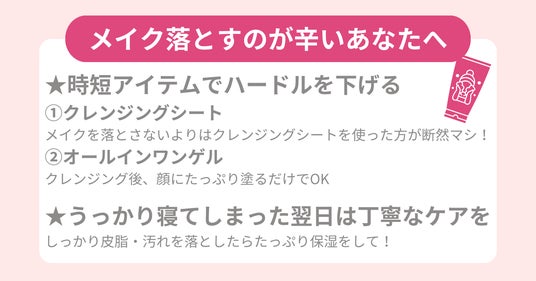 以下で、メイクを落とさずに寝て、肌荒れしてしまうのを防ぐポイントを紹介します。
