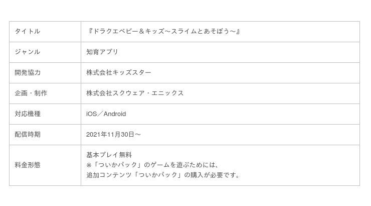 くふうグループにおいて、子ども向けデジタルコンテンツを開発・提供する株式会社キッズスター(以下「キッズスター」)は、株式会社スクウェア・エニックス(以下「スクウェア・エニックス」)が提供する子ども向け知育アプリ『ドラクエベビー&キッズ~スライムとあそぼう~』の開発協力を行い、11月30日より配信を開始しました。