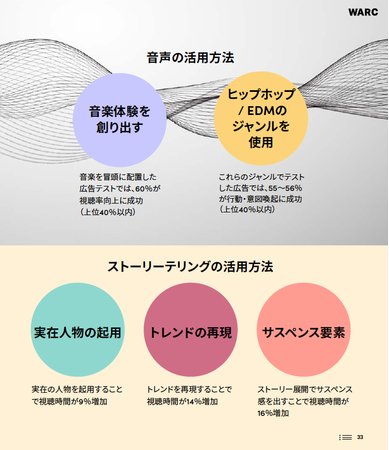 「音声」と「ストーリーテリング」は、ブランド想起を高める2つの重要なクリエイティブ戦略として実証されています。Ipsosの調査によると、「ブランドキューとして音を使用した広告は、ブランドへの注目度が高くなる可能性が8.53倍高い」ことが分かっています。また、メディアサイエンス社とエレンバーグ・バス研究所の調査によると、「6秒間広告のインパクトは30秒間広告の60%である」という結果が得られています。