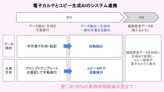 ユビー生成AIのAPI機能を利用することにより、データ抽出から生成までの一連の作業を自動化することで、作成時間を更に最大70%削減できる見込みです。これにより医師や看護師がさらにより多くの時間を患者さんのケアに充てることが可能となります。