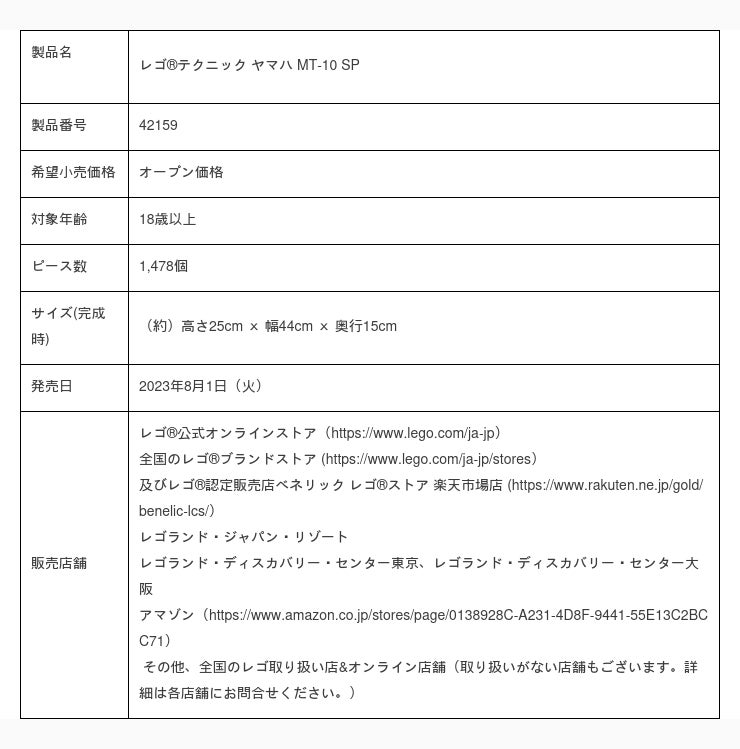 レゴジャパン株式会社(代表取締役社長:マイケル・エベスン/所在地:東京都港区、以下レゴジャパン)は、ヤマハ発動機のハイパーネイキッドバイクの象徴的なフラッグシップモデルを再現した「レゴ(R)テクニック ヤマハ MT-10 SP」を2023年8月1日(火)より販売開始します。