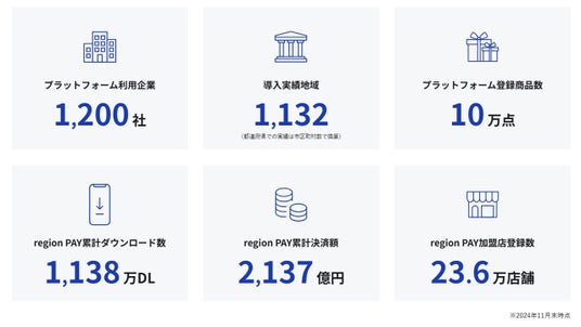 当社は“三方よしの仕組みをつくり「ありがとう」で満ち溢れた社会へ”をミッションに、独自開発のプラットフォームを通じて企業や自治体のDX化を支援しています。2024年11月末時点において、プラットフォーム利用企業は1,200社、導入実績地域は1,132、主力サービスである、デジタル地域通貨アプリ『region PAY』は1,138万ダウンロードまで成長いたしました。
