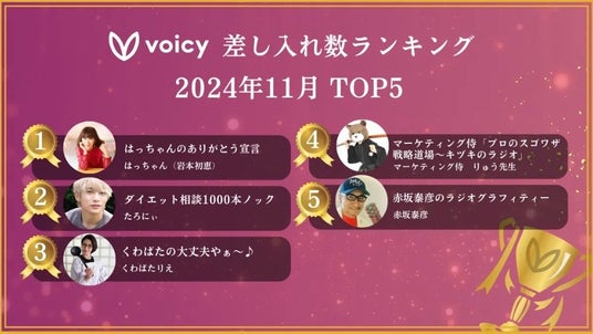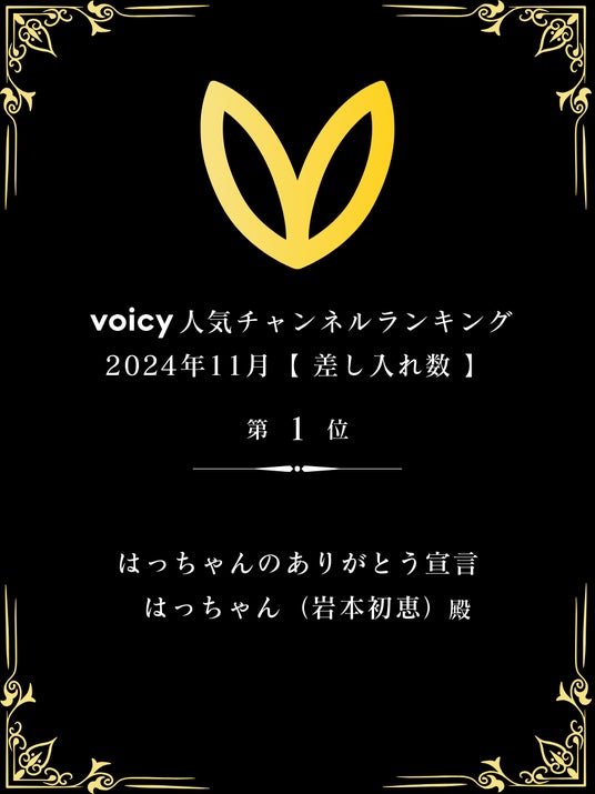株式会社愛しとーとのはっちゃんこと岩本初恵のVoicy「はっちゃんのありがとう宣言」が2024年11月度「差し入れランキング」で第1位を獲得しました。10月度に続いて2ヵ月連続の1位獲得です。