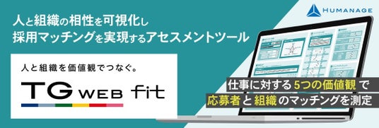 人材の“採用”から“定着”、その先の“活躍”までを支援する人材サービス事業を展開する株式会社ヒューマネージ(本社:東京都千代田区、代表取締役社長:齋藤 亮三)は、仕事に対する“5つの価値観”で人と組織の採用マッチングを実現するアセスメントツール『TG-WEB fit』(ティージーウェブ フィット)のリリースを発表した。
