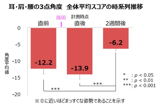 耳・肩・腰の3点がなす直線性を評価したところ、ヘアカラー前と2週間後で有意な「姿勢の改善」が見られました。これはストレートネックや猫背の改善とも解釈できる姿勢変化で、ヘアカラーリングを実施したことでポジティブな心理状態に変化し、その結果として姿勢の改善が引き起こされたと推察されます。