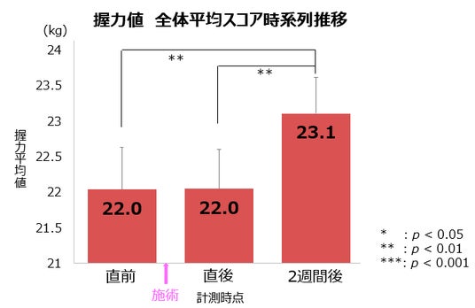 また、ヘアカラー前と2週間後では握力の有意な向上も確認され、この期間における行動変容(人と会う機会の増加など)が影響した可能性が考えられます。