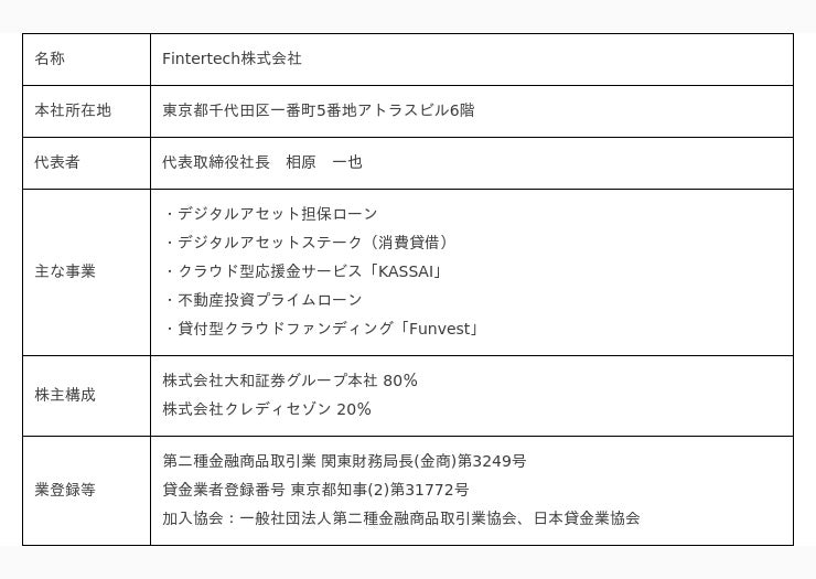 Fintertechは、大和証券グループ及びクレディセゾンがそれぞれ創業来培ってきた金融ビジネスのノウハウを礎としながら、最先端のテクノロジーの活用や外部企業との連携により次世代金融サービスを機動的にかつ柔軟に創出することを目指しています。 主な事業として、暗号資産を活用した「デジタルアセット担保ローン」及び「デジタルアセットステーク(消費貸借)」、クラウド型応援金サービスの「KASSAI」、「未来をわかちあう投資」を提供する貸付型クラウドファンディングサービス「Funvest(ファンベスト)」を展開しています。