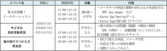 「イーオンこどもでぱーと中野校」では、移転オープンを記念して4月6日(日)、4月20日(日)、5月11日(日)の3日間で特別イベントを開催します。イベントは、満1歳~小学生対象の『異文化体験!イースターレッスン』や、中学生以上対象の『今どきの高校受験英語』、『海外旅行でつかえる英会話』を実施します。本イベントは無料でどなたでもご参加いただけます。また、移転オープンキャンペーンとして、6月29日(日)までにイーオンこどもでぱーと中野校にご入学いただいた方は、お得なご入学特典もご用意しています。